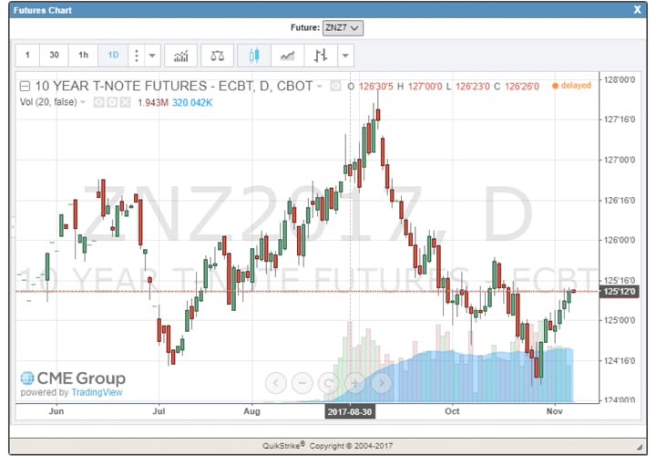 This menu currently contains three menu items if the product is a futures contract and two if it is an option. For futures, the tool will display a link to a futures chart for that product (defaulting to the closest expiration). If the tool can display a chart (via the CME Globex code), one will appear. You will be able to select any of the other available futures contracts for display as well via contract drop down. The other menu items will let you show all the expiration date information for the product in a popup of export that same data into am Excel CSV file.