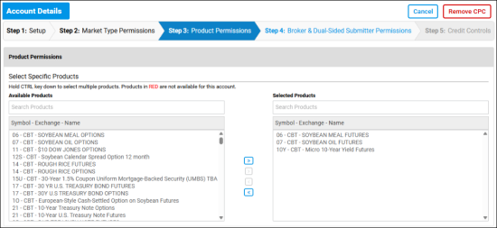 From the Available Products, add product(s) the account will be permitted to trade.