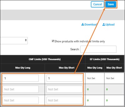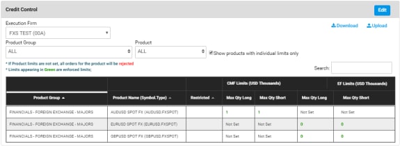 Users can specify the Currency, Credit Limit, Maximum Quantity Long / Short Limits (product quantity limits are not required for CME ClearPort).