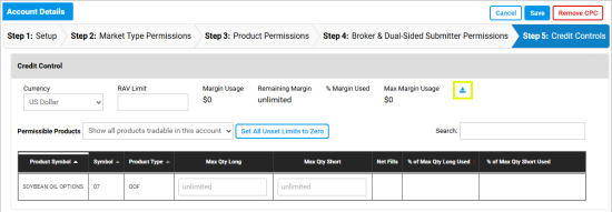 Users can specify the Currency, Credit Limit, Maximum Quantity Long / Short Limits (product quantity limits are not required for CME ClearPort).
