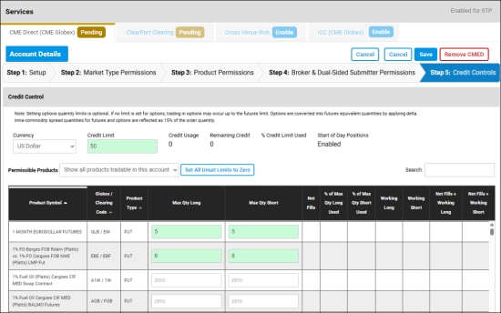 - After selecting a Service and specifying Markets, Products and Brokers & Dual-Sided Submitters, go to the Credit Controls page; available for CME Direct (CME Globex) and ClearPort Clearing.