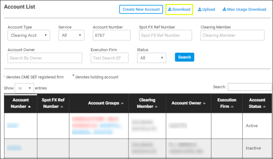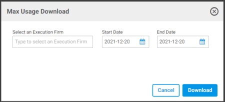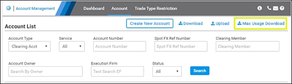 From the Accounts page, Select Max Usage to download a list of ICC accounts, for a given Execution firm, and the maximum credit usage within a specified date range.