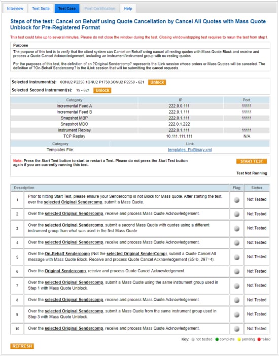 - Prior to selecting Start Test, ensure the selected SenderComp is not Blocked for Mass quotes.