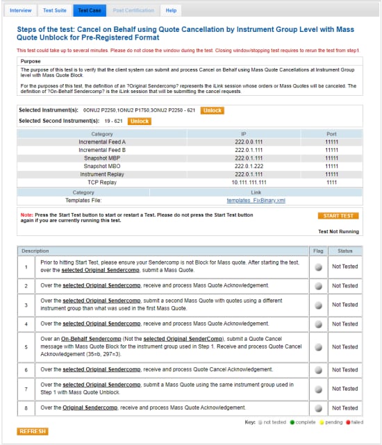 - Prior to selecting Start Test, ensure the selected SenderComp is not Blocked for Mass quotes.