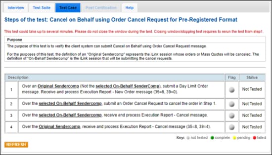 The following instructions illustrate the process to run and complete Cancel on Behalf (COB) using Order Cancel Request tests.