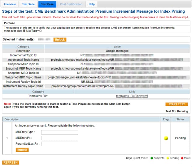 The purpose of this test is to verify that your application can properly receive and process CME Benchmark Administration Premium Market Data Incremental Refresh (tag 35-MsgType=X) messages for index pricing.