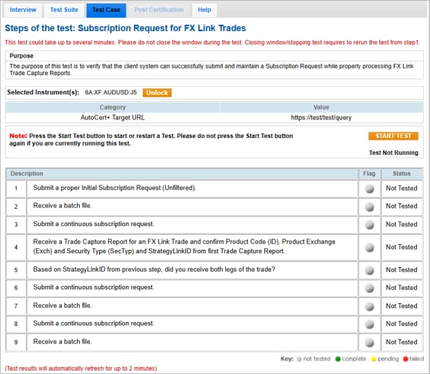 Note: The example test procedure below is for a Subscription Request for FX Link Trades and may not appear in your test suite. The tests included in the test suite will depend on the answers you provided in the Interview.