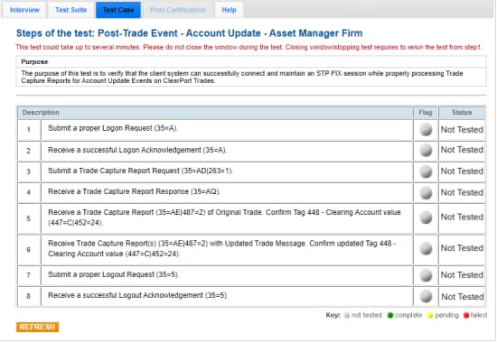 The purpose of this test is to verify that the client system can successfully connect and maintain an STP FIX session while properly processing Trade Capture Reports for Account Update Events on CME ClearPort / CME GlobexTrades.