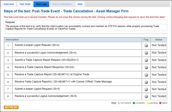 The purpose of this test is to verify that the client system can successfully connect and maintain an STP FIX session while processing Trade Capture Reports for Trade Cancellation Events on CME ClearPort / CME GlobexTrades.