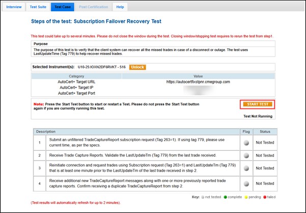 The purpose of this test is to verify that the client system can recover all missed trades in case of a disconnect or outage. The test uses LastUpdateTime (Tag 779) to help recover missed trades.