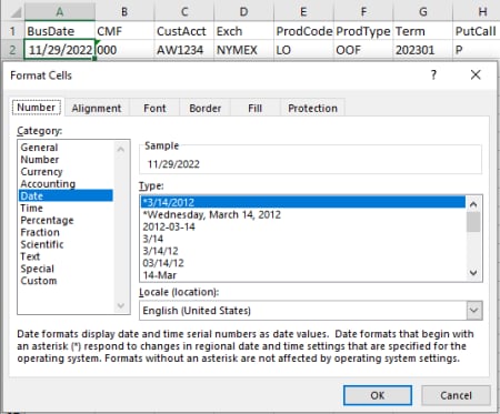 - Right-click the BusDate cell(s) > Select Format Cells > Select Category: Date: *MM/DD/YYYY.