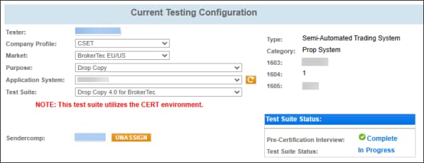 - For Test Suite, select Drop Copy 4.0 for BrokerTec.