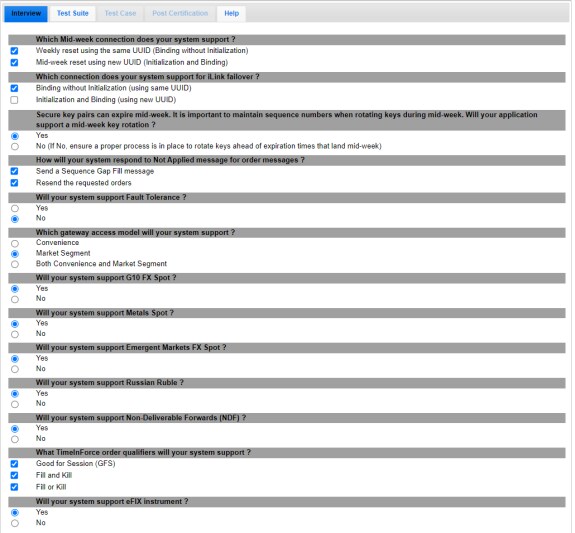 The interview consists of a series of questions about your trading application. Based on your responses, certain tests are required and others are optional. You must complete the pre-certification interview before running the test cases.