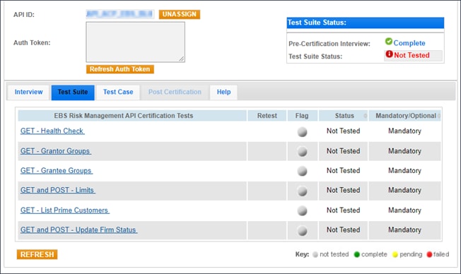The AutoCert+ EBS Risk Management API certification tests are shown in the menu to the right.