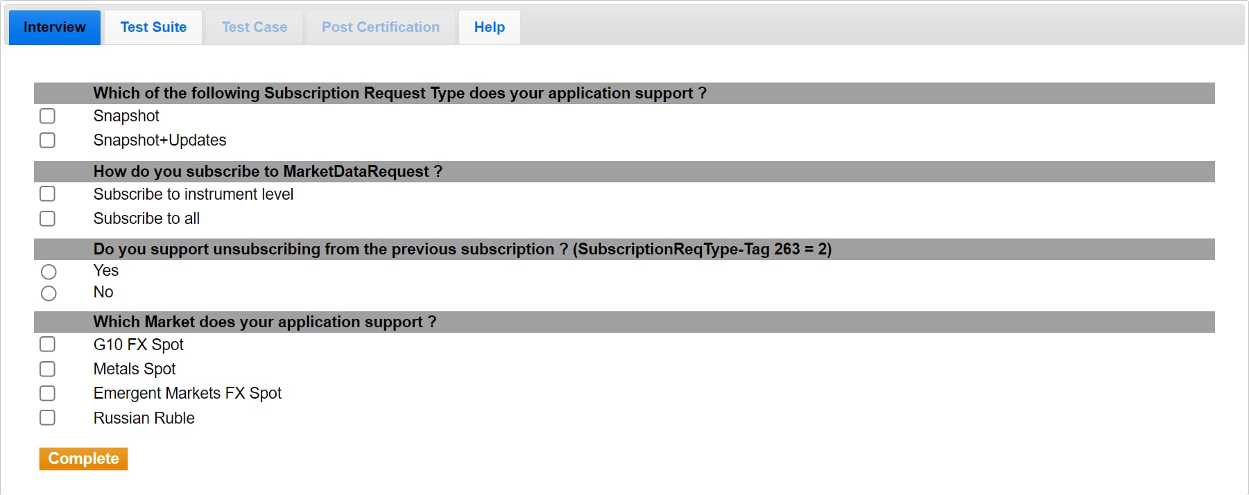 The interview consists of a series of questions about your trading application. Based on your responses, certain tests are required and others are optional. You must complete the pre-certification interview before running the test cases.