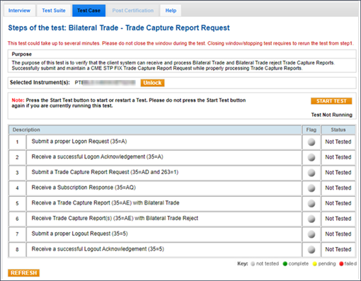 The example test procedure below is for a Venue Filtered Trade Capture Report Request and may not appear in your test suite. The tests included in the test suite will depend on the answers you provided in the Interview.