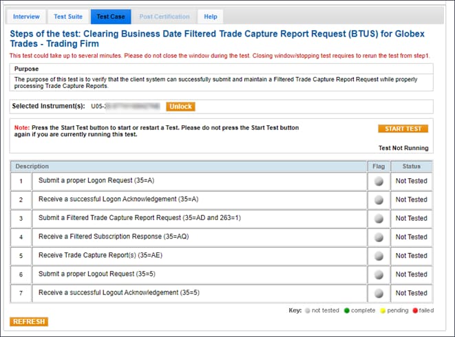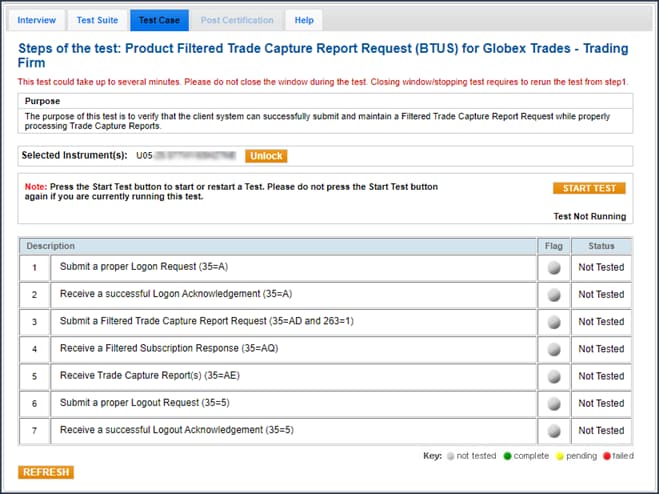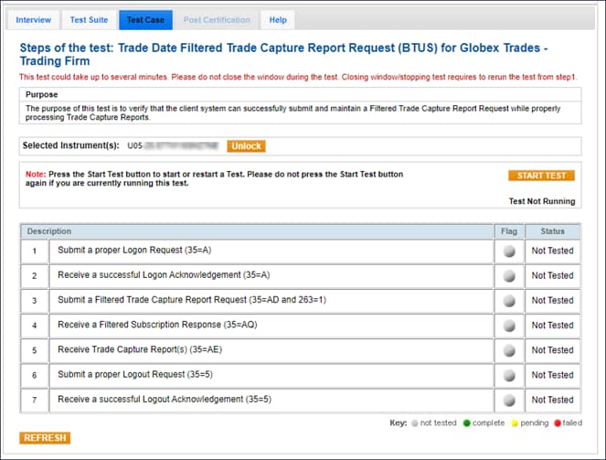 The example test procedure below is for a Standard Trade Capture Report Request (BTUS) and may not appear in your test suite. The tests included in the test suite will depend on the answers provided in the Interview.
