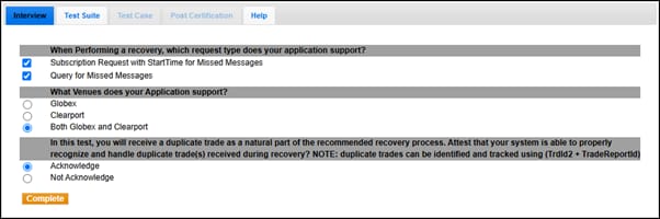 The interview consists of a series of questions about your trading application. Based on your responses, certain questions and tests are required and others are optional. You must complete the pre-certification interview before running the test suite.
