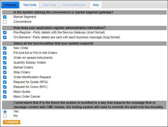 The interview tab consists of a series of questions about the order entry system. Based on the response, certain tests will be mandatory. A complete response to the interview questions is required before any test can be accessed.