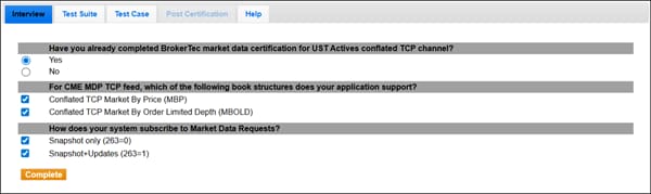 The interview consists of a series of questions about your trading application. Based on your responses, certain tests are required and others are optional. You must complete the pre-certification interview before running the test cases.