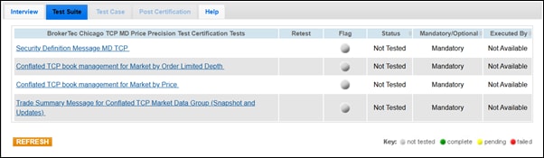 This section contains information on the certification tests for the AutoCert+ BrokerTec Chicago Market Data TCP test suite. You are required to select and run each test in the test suite.