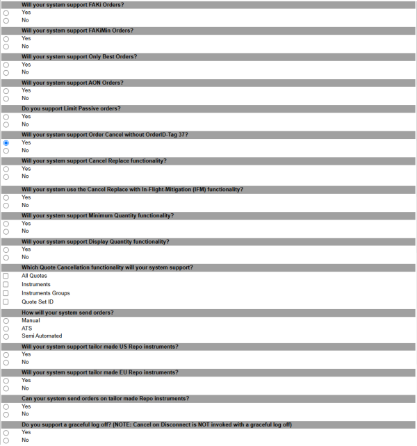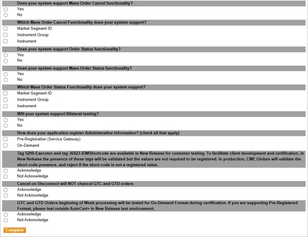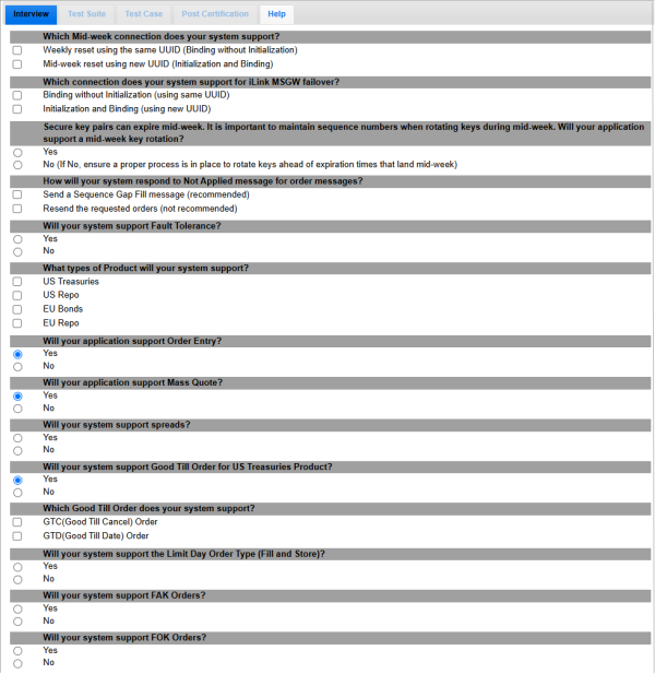 The interview consists of a series of questions about your trading application. Based on your responses, certain tests are required and others are optional. You must complete the pre-certification interview before running the test cases.