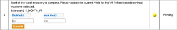 - The start of the week recovery is complete. Enter the current Yield (tag 423-PriceType=9) for the WI (When Issued) contract that you selected.