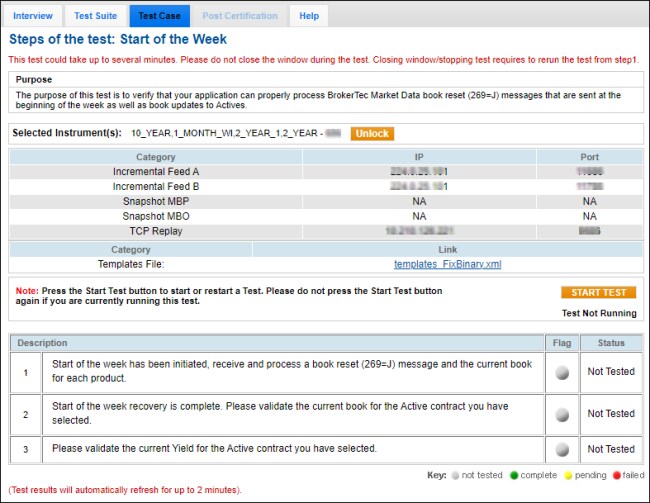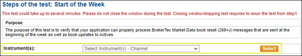 This test verifies that your application system can properly process BrokerTec Market Data Incremental Refresh (tag 35-MsgType=X) book reset (tag 269-MDEntryType=J) messages that are sent at the beginning of the week as well as book updates to actives.
