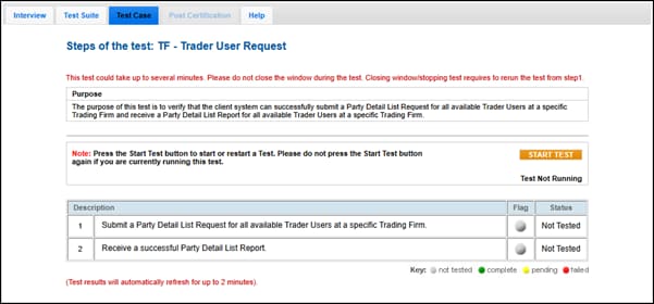 The purpose of this test is to verify that the client system can successfully submit a Party Detail List Request and receive a Party Detail List Report for all available Trader Users at a specific Trading Firm.