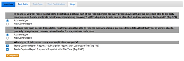 The interview consists of a series of questions about your trading application. Based on your responses, certain questions and tests are required and others are optional. You must complete the pre-certification interview before running the test suite.
