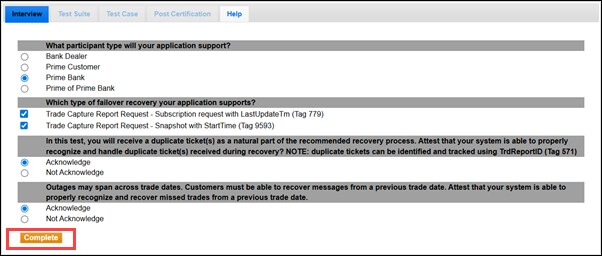 The interview consists of a series of questions about your trading application. Based on your responses, certain questions and tests are required and others are optional. You must complete the pre-certification interview before running the test suite.