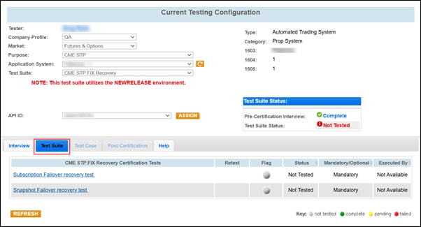 Use the Test Suite tab to select and run the CME STP FIX Recovery Certification Tests required to certify your application. You are required to select and run each test in the test suite.