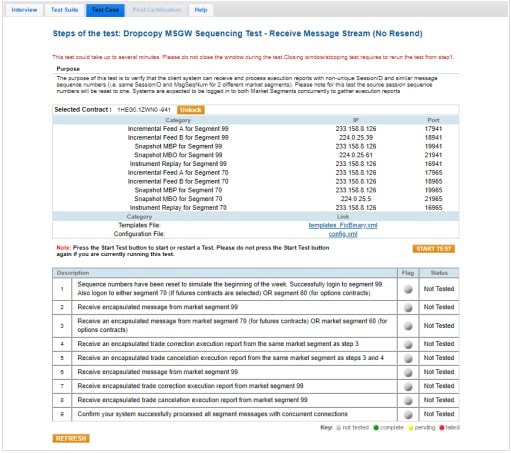 Note: For this test, the source session sequence numbers will be reset to 1. Systems are expected to be logged in to both market segments concurrently to gather Execution Reports.