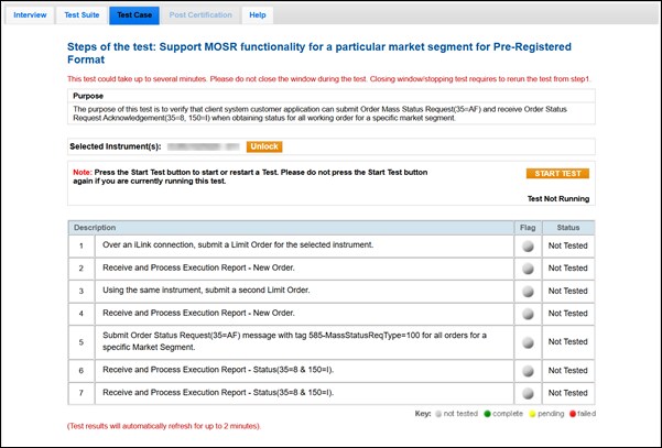 The purpose of this test is to verify that the client system customer application can submit an Order Mass Status Request (35=AF) and receive an Order Status Request Acknowledgement (35=8, 150=I) when obtaining status for all working orders for a specific market segment.