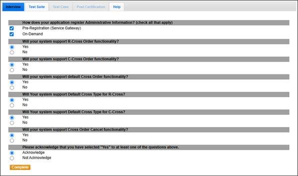 The interview consists of a series of questions about your trading application. Based on your responses, certain questions and tests are required and others are optional. You must complete the pre-certification interview before running the test suite.