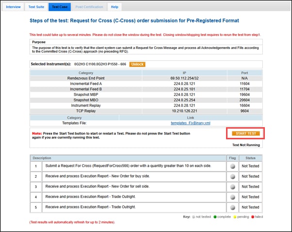 The purpose of this test is to verify that the client system can submit a Request for Cross (R-Cross) Message, wait for the proper RFC window, and process all Acknowledgments and Fills.
