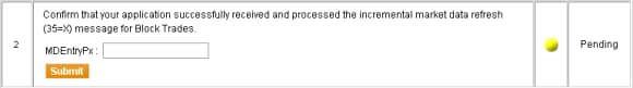 - Enter the tag 270-MDEntryPx value that your application received to confirm that your system successfully received and processed the Market Data Incremental Refresh (35=X) message for Block Trades.