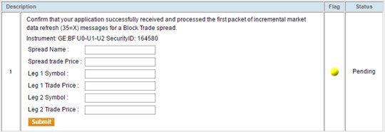 - Enter the following tag values from the first packet of Market Data Incremental Refresh (35=X) messages for a Block Trade spread that your application received.