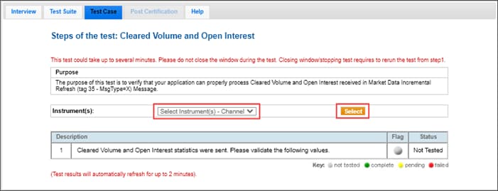The purpose of this test is to verify that your application can properly process Cleared Volume and Open Interest received in a Market Data Incremental Refresh (tag 35-MsgType=X) message.