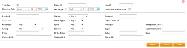 - Search to perform an advanced search of records and view trades cleared within a specific date range. The trades shown can be narrowed by the selection of additional filter options. Depending on user privileges, available filter fields may vary.