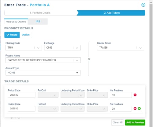 Building a portfolio manually is aided by a build wizard--prompting users to create the portfolio by building positions or trades in eligible instruments. You may then immediately add trade details and view margin requirements.