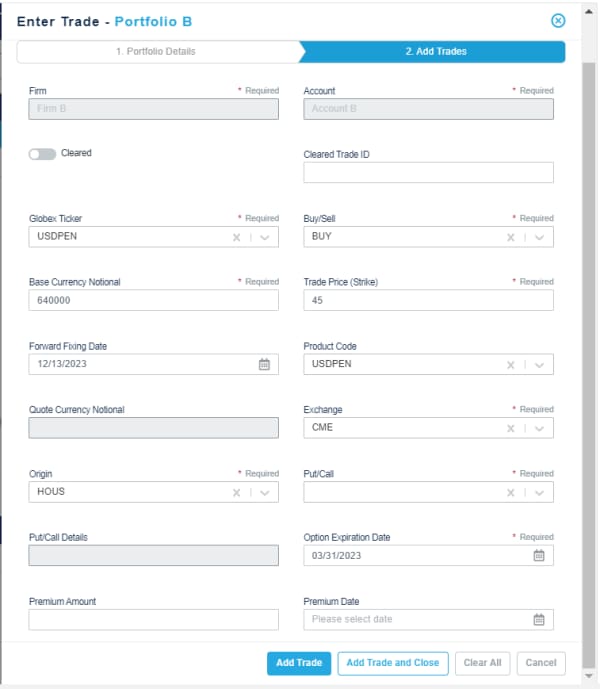 - In the wizard's 2. Add Trades tab, identify products details for trades in this portfolio: