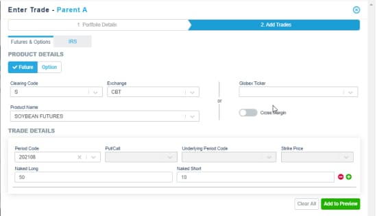- In the wizard's 2. Add Trades tab, identify products and trades for this parent positions and select Add to Preview. Parent positions are represented as "Naked Long" or "Naked Short" quantities.