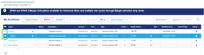 - Check the boxes for the parent and child portfolio. Since child account margin impacts the parent account, margining a child account in isolation will also re-margin the parent account.