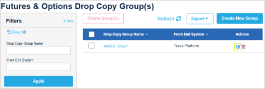 - From the Drop Copy Groups page, select Registered Entity, then select the edit (