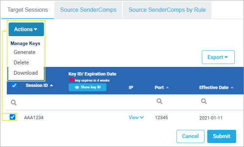 - Select the Target Session tab, then select the Session ID checkbox, then Manage Keys > Generate Keys.