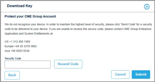 - SMS code: Sent to the default CME Group Login mobile phone.