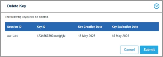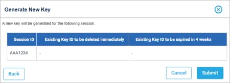 Using self-service functions, users can generate and manage key pairs ( + ) to secure user login and Drop Copy message activity.
