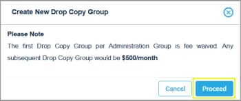(if applicable) A dialog indicates the number of existing Drop Copy groups and the fee for creating a new group.