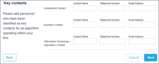 - Key Contacts (required): Personnel identified as key contacts for an algorithm operations within a firm. If necessary, CME Group will contact these individuals for questions or issues.